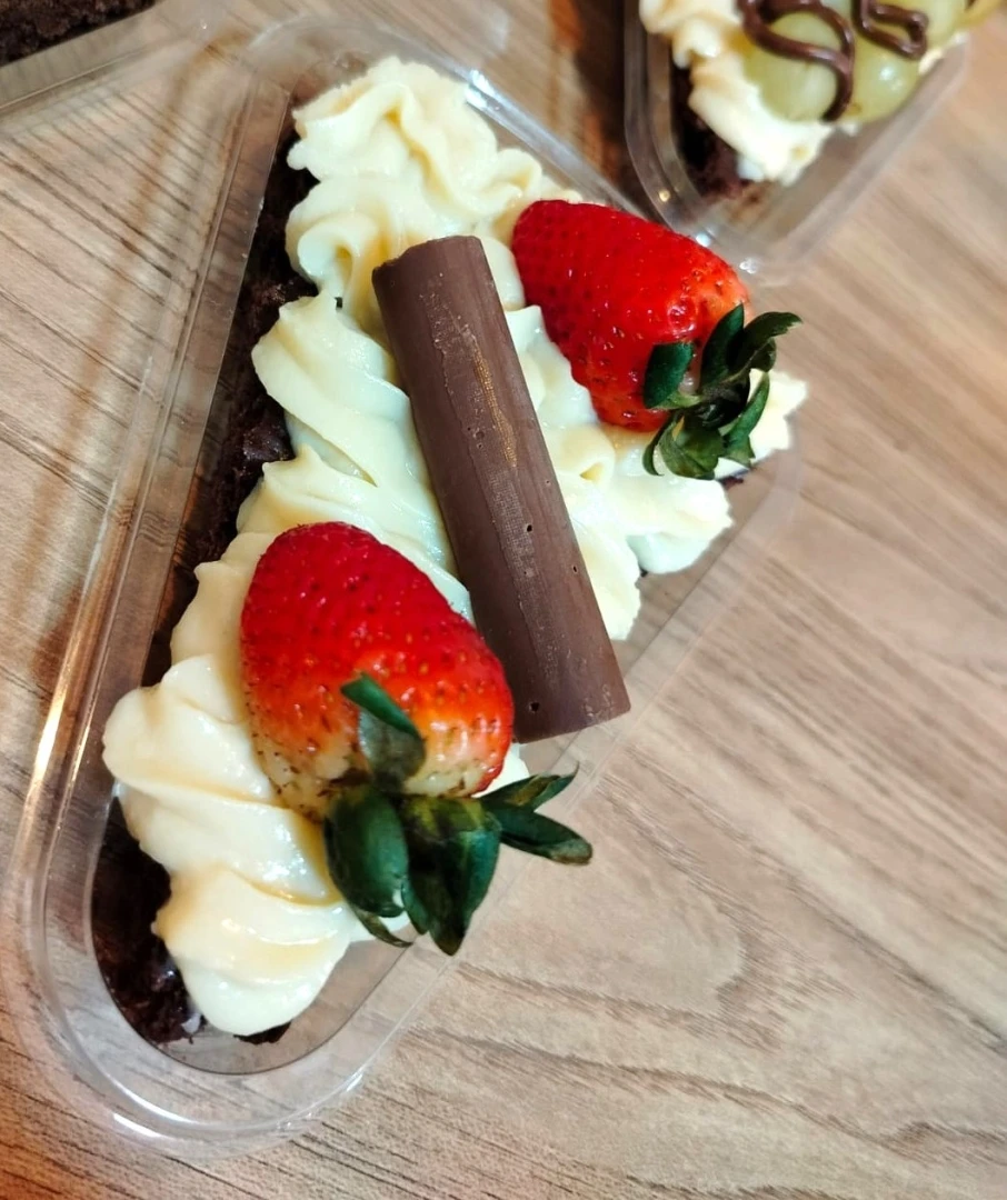 Uma combinação que é puro amor! Nosso brownie artesanal, com sabor intenso de chocolate, recebe uma camada cremosa de Ninho e é finalizado com morangos frescos e suculentos. O contraste entre o doce do creme e o leve toque azedinho da fruta cria uma experiência equilibrada e irresistível, perfeita para quem ama um doce cheio de sabor e frescor.